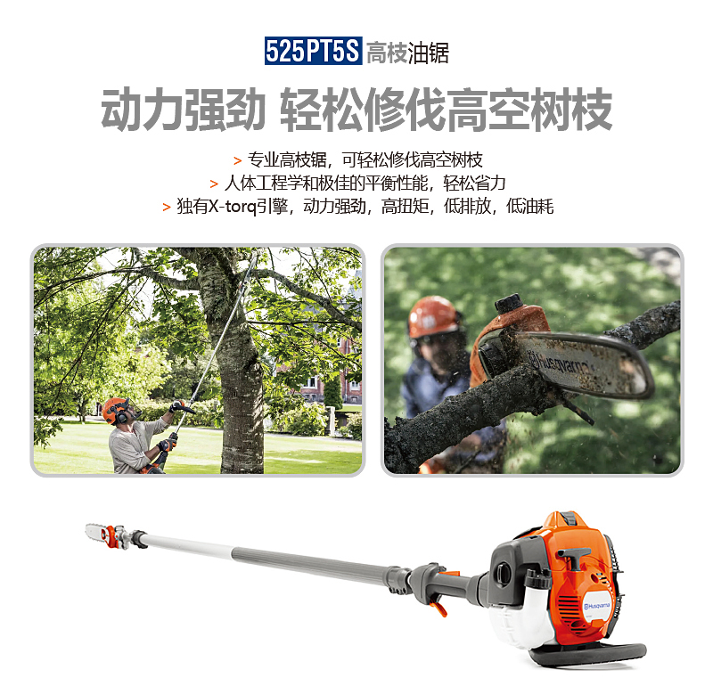 为专业用户而设计,富世华525PT5S配备延长杆,可以清除高空树枝,人体工程学和平衡性助您以轻松的方式完成任务。操作简便,X-Torq®引擎保证强劲动力,高扭矩,低排放和低油耗。